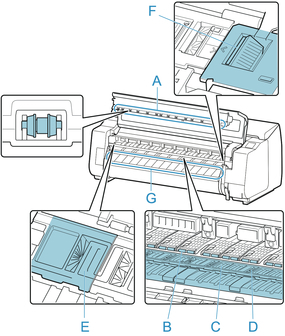 6. Pase un paño húmedo completamente escurrido por el interior de la tapa superior para limpiarla. Limpie todo residuo de tinta o polvo del papel (restos dejados tras el corte) del rodillo de la cubierta superior (A), la sujeción de papel (B), toda la placa (C), los surcos de tinta de impresión sin bordes (D), los bordes de los orificios de succión de tinta izquierdo y derecho (E, F), la guía de salida (G) y así sucesivamente.