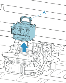 프린트 헤드의 파란색 손잡이(A)를 잡고 제거한 다음 OK를 누릅니다.