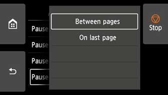 한 페이지씩 인쇄하려는 경우 및 용지가 배출되기 전에 대기 시간을 두는 것을 선호하는 경우 페이지 사이(Between pages)를 선택하고, 마지막 페이지를 인쇄한 후의 대기 시간에 우선 순위를 두는 경우 마지막 페이지(On last page)를 선택합니다.
