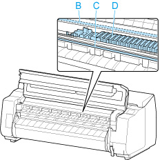 선형 눈금자(B), 캐리지 샤프트(C) 또는 잉크 튜브 안정 장치(D)를 만지지 마십시오. 이 부분을 만지면 고장날 수 있습니다.