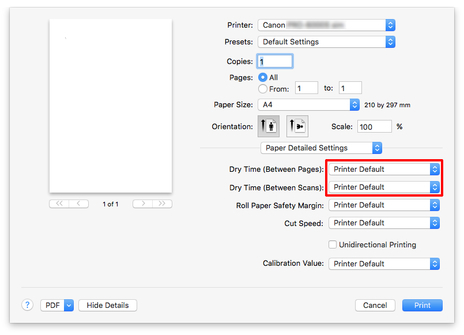 3. Selezionare i valori desiderati dagli elenchi per Tempo asciug. (tra pag.) (Dry Time (Between Pages)) e Tempo asciug. (tra sca.) (Dry Time (Between Scans)).