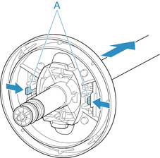 3インチ紙管アタッチメントを取り外す場合は、ツメ(A)を内側に押して、アタッチメントを取り外します。