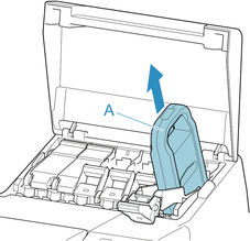 Ziehen Sie das Griffteil (A) der Sperrhebel für die Tintenpatrone der jeweiligen Farbe nach vorne, um den Behälter auszutauschen, während Sie auf die Komponente B drücken.
