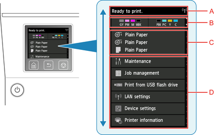 From the Home screen, you can check the printer status and select the maintenance, settings, and other menus. Flick the Home screen up and down, and select the display position.