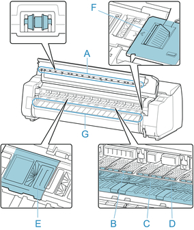 Pase un paño húmedo completamente escurrido por el interior de la tapa superior para limpiarla. Limpie todo residuo de tinta o polvo del papel (restos dejados tras el corte) del rodillo de la cubierta superior (A), la sujeción de papel (B), toda la placa (C), los surcos de tinta de impresión sin bordes (D), los bordes de los orificios de succión de tinta izquierdo y derecho (E, F), la guía de salida (G) y así sucesivamente.