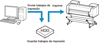 Cuando envía un trabajo de impresión a la impresora, puede guardarlo en la impresora después de imprimir o simplemente guardarlo en la impresora sin imprimirlo aún. Los trabajos de impresión guardados se pueden imprimir en la cantidad deseada más tarde sin necesidad de utilizar de nuevo un ordenador.