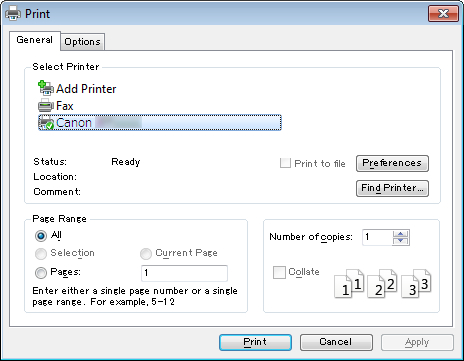 • L'aspetto della finestra di dialogo varia a seconda dell'applicazione software. Nella maggior parte dei casi, la finestra di dialogo include le opzioni di stampa di base e consente di scegliere la stampante, specificare l'intervallo di pagine, il numero di copie e così via.
