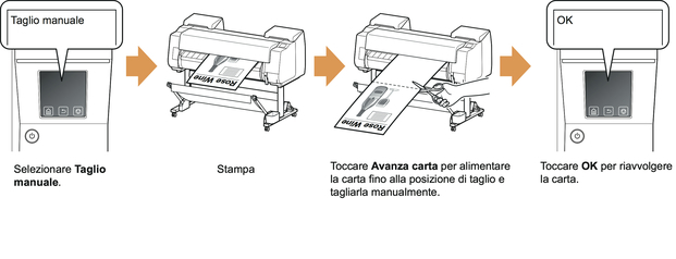 Taglio automatico Vedere "Taglio della carta in rotoli dopo la stampa" (Windows). Vedere "Taglio della carta in rotoli dopo la stampa" (Mac OS). |