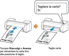 Effettuare questa selezione se si desidera tagliare la carta in rotolo con la Lama di taglio utilizzando il touchscreen dopo la stampa con No o Stampa guida taglio selezionato in Taglio automatico nel driver della stampante. Altrimenti scegliere questa opzione se si desidera tagliare il bordo del rotolo dopo il caricamento di un rotolo. |