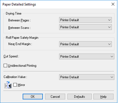 3. Nella finestra di dialogo Impost. dettag. carta (Paper Detailed Settings) visualizzata in seguito, selezionare i valori desiderati dagli elenchi per Tra le pagine (Between Pages) e Tra le scansioni (Between Scans) in Tempo asciugatura (Drying Time), quindi fare clic su OK.