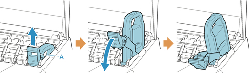 交換する色のインクタンク固定レバーの持ち手部(A)をBの位置にあるボタンを押しながら手前に引きます。