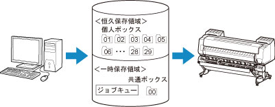 プリンターのハードディスクの保存領域は、一時保存領域と恒久保存領域に分かれています。一時保存領域にはジョブキューを保存する領域と共通ボックスがあり、恒久保存領域には個人ボックスがあります。