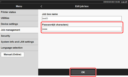 - 암호를 설정한 경우에도 리모트 UI의 관리자 모드에서 개인 상자에 액세스하는 경우에는 암호가 필요하지 않습니다.
