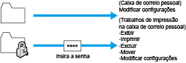 Para uma maior segurança, você pode especificar uma senha para as caixas pessoais. Depois de definir uma senha, ela será exigida para modificar as configurações da caixa pessoal, bem como para exibir, imprimir, excluir, mover e modificar trabalhos salvos na caixa pessoal.