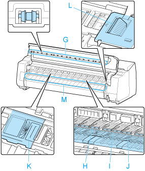 상단 커버 롤러(G), 용지 리테이너(H), 전체 플래튼(I), 테두리 없는 인쇄 잉크 받이 홈(J), 왼쪽 및 오른쪽 잉크 흡입구(K, L)의 주변부 및 출력 가이드(M) 등에서 잉크 잔여물과 종이 가루(절단 부스러기)를 모두 닦아냅니다.