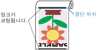 백 라이트 필름과 같이 절단 가루가 발생하기 쉬운 용지의 경우 터치 스크린 메뉴에서 절단 가루 감소(Cut-dust reduction)를 ON으로 설정하면 인쇄물의 앞 가장자리와 뒤 가장자리가 잉크로 코팅되어 절단 가루가 날리는 것을 줄일 수 있습니다. 따라서 프린트 헤드 관련 문제를 줄일 수 있습니다. 용지 종류에 따라 절단 가루 감소(Cut-dust reduction)를 설정할 수 있습니다.