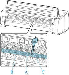 Non toccare la scala lineare (A), lachiavetta carrello (B) o lo stabilizzatore del tubo d'inchiostro (C). Il contatto potrebbe danneggiarli.
