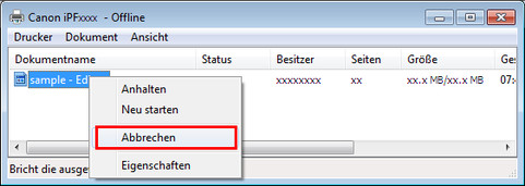 Klicken Sie zum Abbrechen mit der rechten Maustaste auf den Auftrag, und wählen Sie Abbrechen (Cancel).