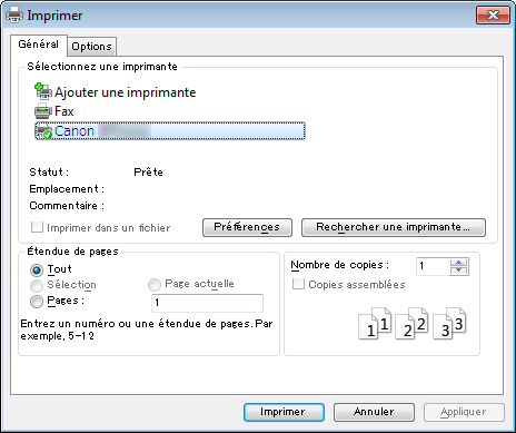 L'aspect de la boîte de dialogue dépend du logiciel de l'application. Dans la plupart des cas, la boîte de dialogue propose les options d'impression de base et vous permet de choisir l'imprimante, d'indiquer l'étendue de pages, le nombre de copies, etc.