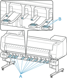 물기를 꼭 짠 젖은 천으로 용지와 접촉하는 영역(A, B)에서 잔여물과 종이 가루를 닦아내고 마른 천으로 닦아 건조시킵니다.