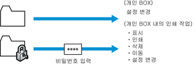 개인 상자에 암호를 설정하여 보안을 강화할 수 있습니다. 암호를 설정하면 개인 상자 설정을 변경하거나 개인 상자에 저장된 작업을 표시, 인쇄, 삭제, 이동 및 변경하려는 경우 암호가 필요합니다.