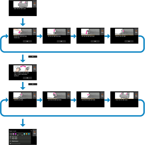 Para las acciones que la impresora no puede detectar, puntee OK para mostrar la pantalla de instrucciones para el siguiente paso.