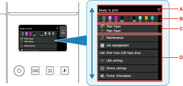 Consente di visualizzare lo stato della stampante, i messaggi e altre informazioni. Toccare questa voce quando viene mostrato un messaggio per visualizzare il messaggio nella schermata di elenco e passare alla schermata con le informazioni dettagliate e le operazioni.