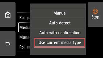 Ao carregar o papel em rolo, um menu para seleção do tipo de mídia é exibido na tela sensível ao toque. Toque no tipo de mídia.
