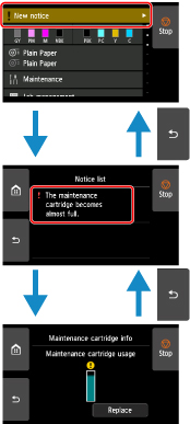 Quando houver pouca tinta ou se houver outra notificação, Novo aviso. (New notice) será exibido na área de exibição das informações da impressora. Toque para exibir a tela Lista de avisos (Notice list) para visualizar as mensagens, com a mais recente exibida em primeiro lugar. Toque em uma mensagem para exibir os detalhes e executar uma ação.
