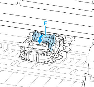 Segure a guia (F) da tampa de fixação da cabeça de impressão e abaixe-a para frente para bloquear a cabeça de impressão.