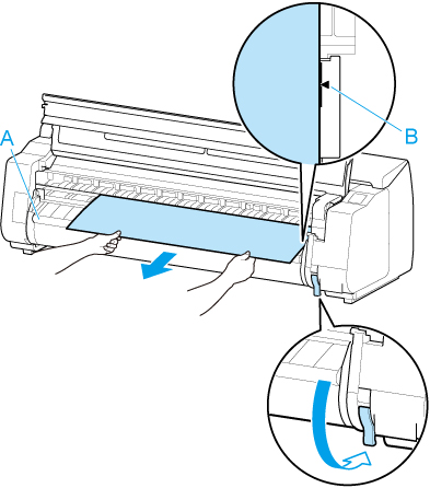 Segure no meio da borda inicial do papel em rolo e puxe-a de forma suave e uniforme até atingir a posição da guia de saída (A). Neste momento, alinhe a borda direita do papel em rolo paralela à linha de alinhamento do papel (B). Quando o papel estiver paralelo à linha, abaixe a alavanca de liberação.
