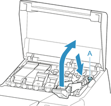 Нажмите спусковой рычаг (A), как показано, плавно возвращая все фиксирующие рычаги чернильных контейнеров в исходное положение.