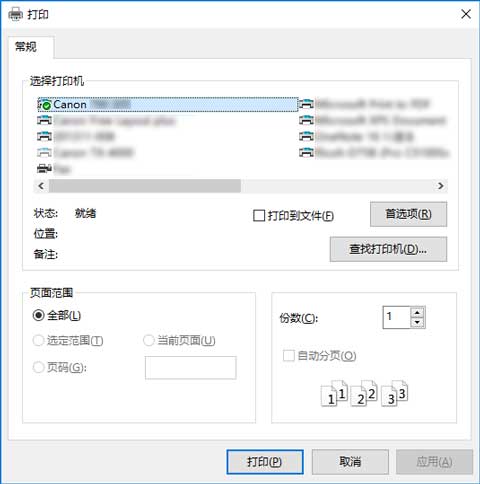显示的对话框根据软件应用程序会有所不同。 在大多数应用程序中,可以通过此对话框选择打印机、指定页面范围和打印份数等基本打印选项。