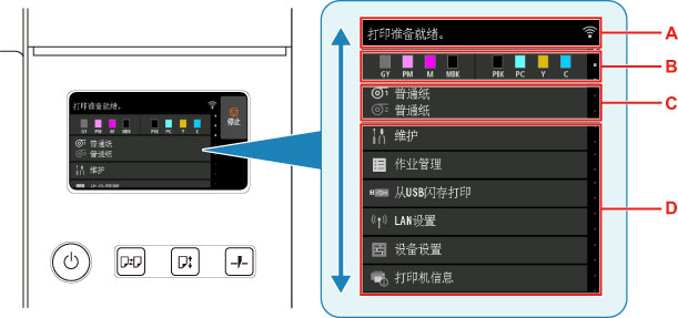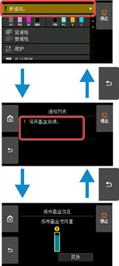 显示打印机状态、信息和其他信息。 出现信息时点击此项,可在列表屏幕上查看信息并跳转至显示详细信息和操作的屏幕。