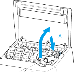 Tire hacia abajo de la palanca de liberación (A) tal como se muestra en la imagen al tiempo que devuelve las palancas de bloqueo del depósito de tinta a sus posiciones originales.