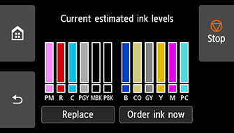 Aparecerá la pantalla Niveles tinta actuales estimados (Current estimated ink levels).