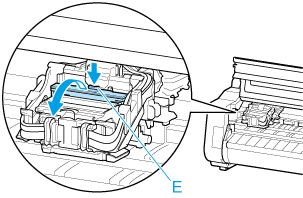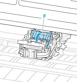 Sujete la pestaña (F) de la cubierta de bloqueo del cabezal de impresión y bájela hacia delante para bloquear el cabezal de impresión.
