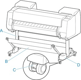 - Suporte que segura a impressora. Equipado com rodinhas para facilitar a movimentação da impressora.