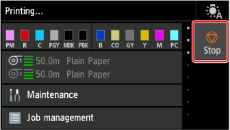 Para cancelar a impressão ou recepção de trabalhos de impressão, toque em Parar (Stop) na tela sensível ao toque.