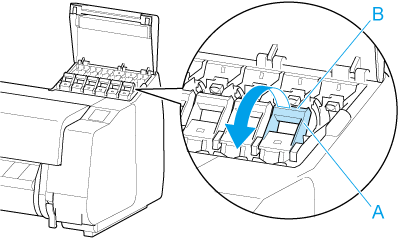 Puxe a peça da alça (A) da alavanca de bloqueio do cartucho de tinta da cor a ser substituída em sua direção enquanto pressiona o botão localizado na parte de trás da peça da alça (B).