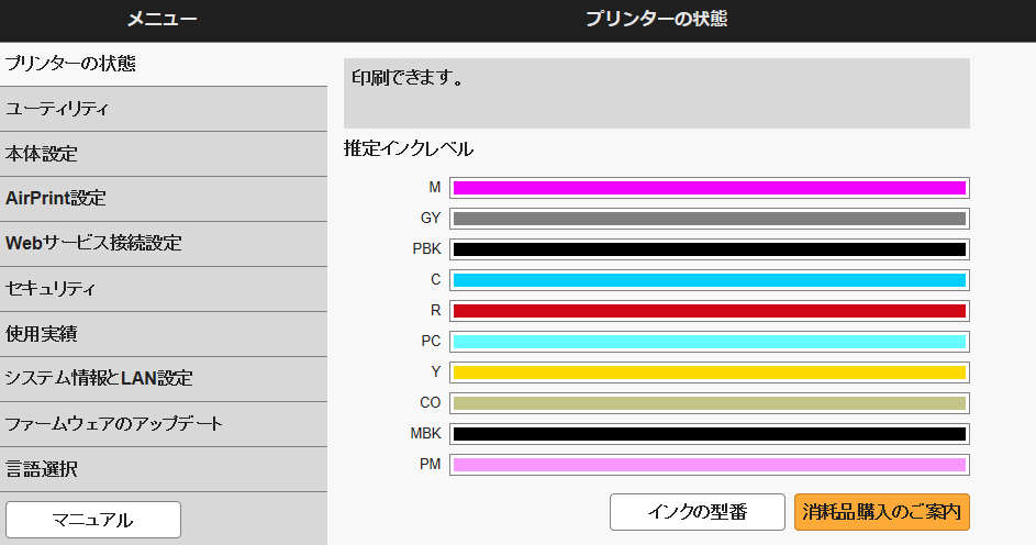 プリンターのインク残量、ステータス、エラーの詳細情報などを表示します。