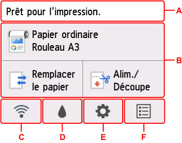 - Affiche les informations sur le papier chargé dans la zone supérieure. Toucher cette option affiche le menu concernant le papier et autorise les paramètres du papier. Les options Remplacer le papier et Alim./Découpe fréquemment utilisées dans le menu s'affichent dans la zone inférieure et vous pouvez les sélectionner directement.