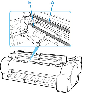 Ne touchez pas l'échelle linéaire (A) ou le rail du chariot (B). Vous pourriez vous tacher les mains, et cela pourrait endommager l'imprimante.