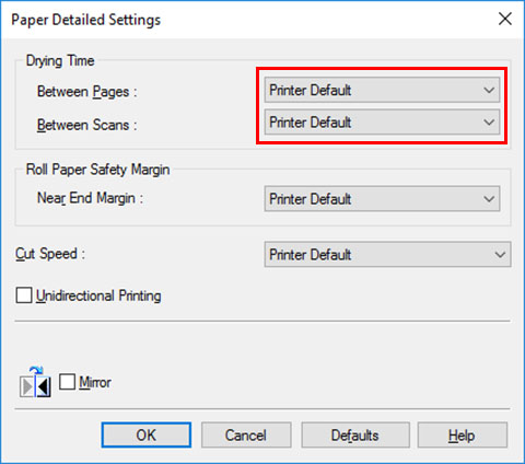 Nella finestra di dialogo Impost. dettag. carta visualizzata in seguito, selezionare negli elenchi i valori desiderati per Tra le pagine e Tra le scansioni in Tempo asciugatura, quindi fare clic su OK.