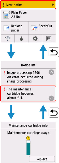 Se l'inchiostro è quasi esaurito o in presenza di altre notifiche, nell'area di visualizzazione delle informazioni della stampante viene visualizzato Nuovo avviso. (New notice). Toccare questa voce per visualizzare la schermata Elenco avvisi (Notice list) e visualizzare i messaggi a partire dal più recente. Toccare un messaggio per visualizzare la schermata dei dettagli del messaggio per visualizzare i dettagli e agire.