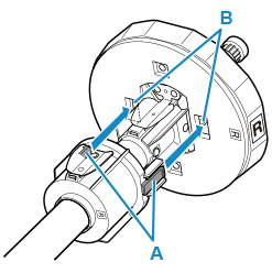 如图所示,将支架止动器从左侧插入卷纸支架,然后在握住位置(B)的同时适当用力推支架止动器,直到其凸缘(A)触及卷纸。 向