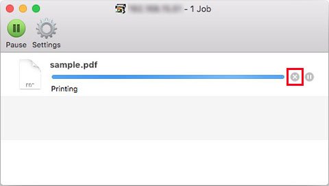 Haga clic en × para el trabajo de impresión que desea cancelar o, bien, seleccione el trabajo de impresión que desea cancelar y, a continuación, haga clic en Eliminar (Delete) para eliminar el trabajo.
