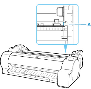 Ao usar o suporte do rolo e nos seguintes casos, remova o suporte do rolo e ajuste a folha cortada de acordo com a linha de alinhamento do papel (A) no lado direito da impressora.