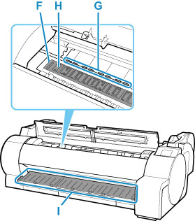 プラテン全域(F)、用紙押さえ(G)、フチなし印刷インク受け溝(H)、排紙ガイド(I)などのインクの汚れや紙粉(カット屑など)をふき取ります。
