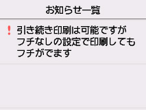 プリンターで、長期間にわたって大量のフチなし印刷を行うと、タッチスクリーンに警告メッセージが表示されて、[フチなし時のはみ出し量]の設定ができなくなります。